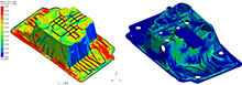 We utilize FEA and CFD to optimize part design and molding processes. For example, in FMC™ (CF-SMC), physical properties change significantly due to fiber orientation that occurs during molding. Therefore, by mapping fiber orientation analysis and mechanical properties, it is possible to predict part performance.