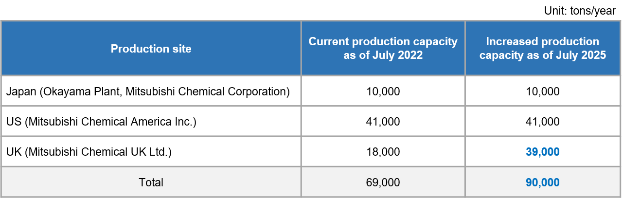 The Mitsubishi Chemical Group (the MCG Group) hereby announces that it has decided to increase its annual production capacity of SoarnoL™ ethylene vinyl alcohol copolymer (EVOH) resin by 21,000 tons in the United Kingdom. The production increase is slated to take effect in July 2025.