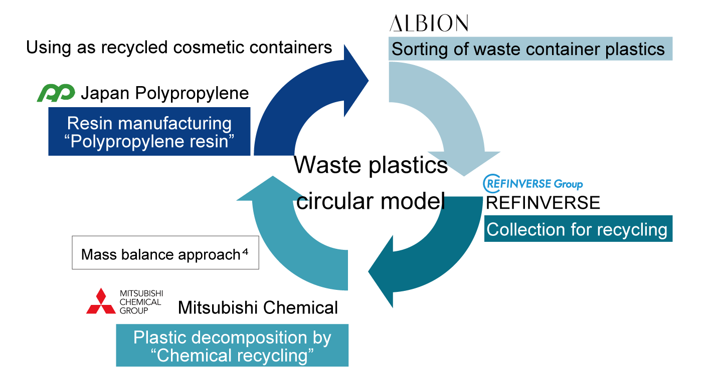 The Mitsubishi Chemical Group1 (the MCG Group) is starting a collaboration with ALBION Co., Ltd. (ALBION), a manufacturer and retailer of luxury cosmetics. Under the collaboration framework, waste plastics generated at ALBION will be transformed into new cosmetic containers through chemical recycling2 by the MCG Group.