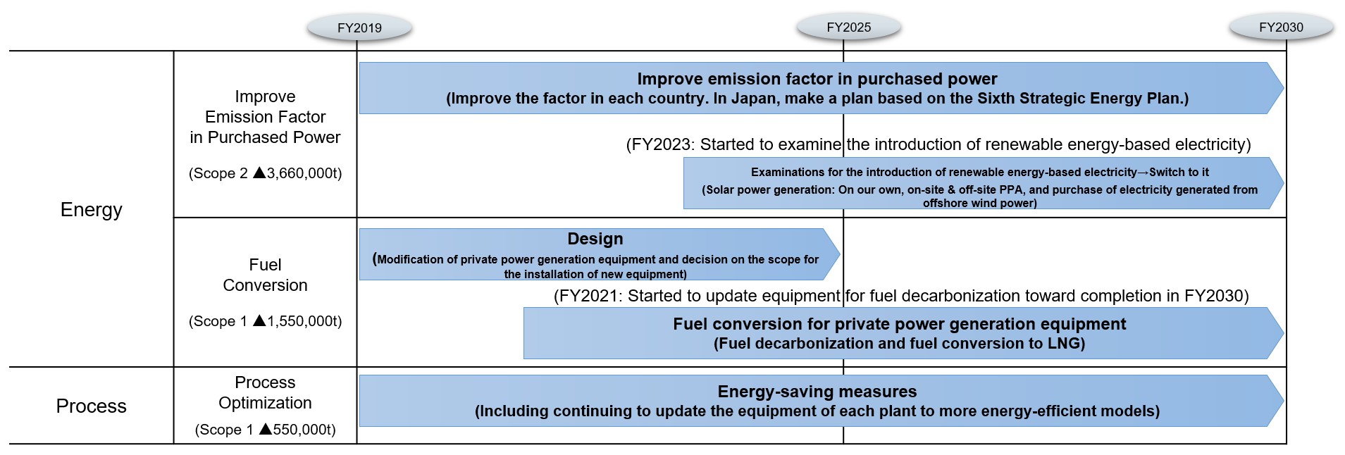 Toward the achievement of our GHG emission reduction targets, we will invest a total of around 100 billion yen to modify/install private power generation equipment and to implement energy-saving measures by FY2030.