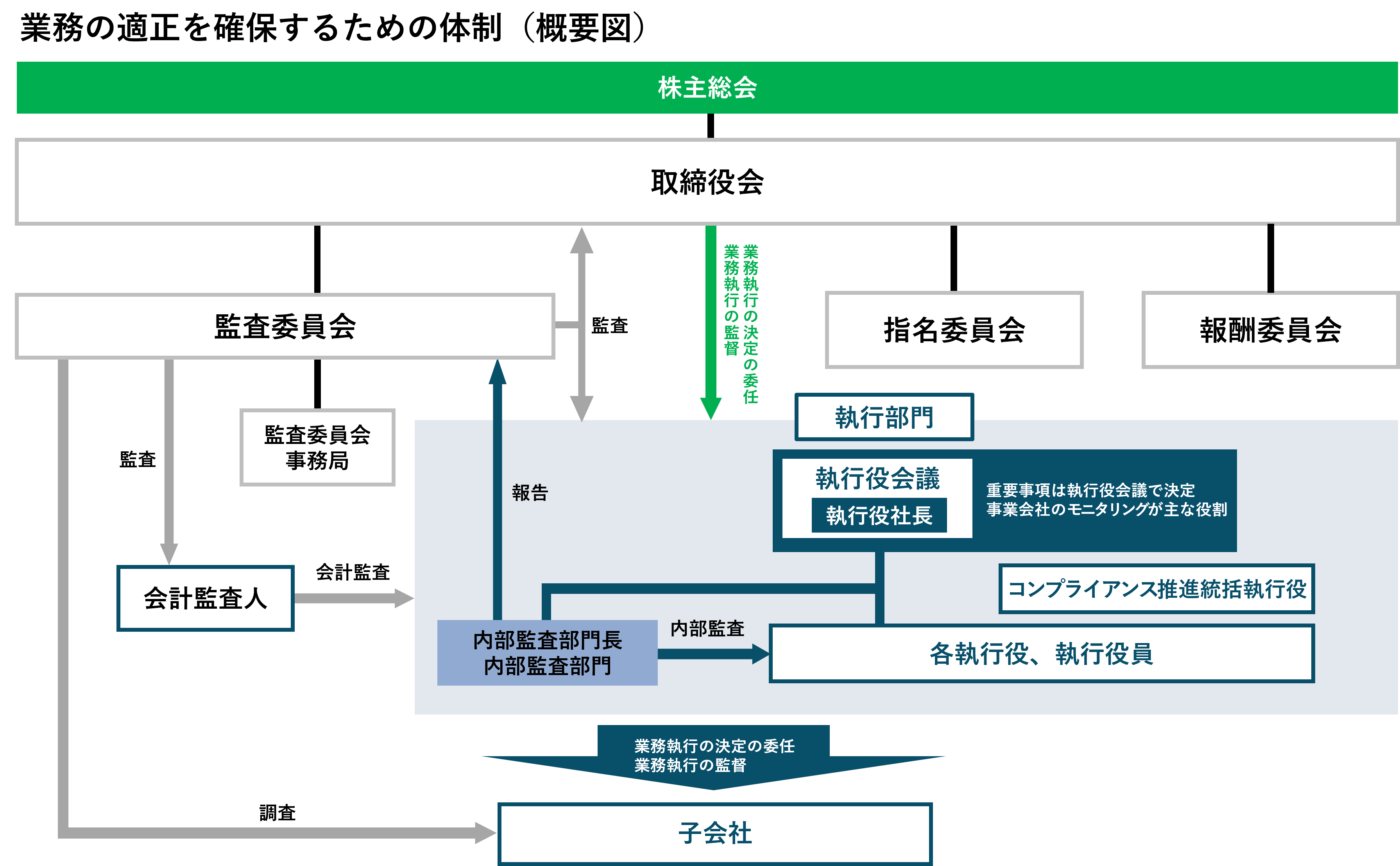 当社は、指名委員会等設置会社として、取締役会並びに指名、監査及び報酬の3つの委員会が主に経営の監督を担う一方、執行役が業務執行の決定及び業務執行を担う体制とし、監督と執行の分離を進め、経営の透明性・公正性の向上、経営監督機能の強化及び意思決定の迅速化による経営の機動性の向上に努めています。