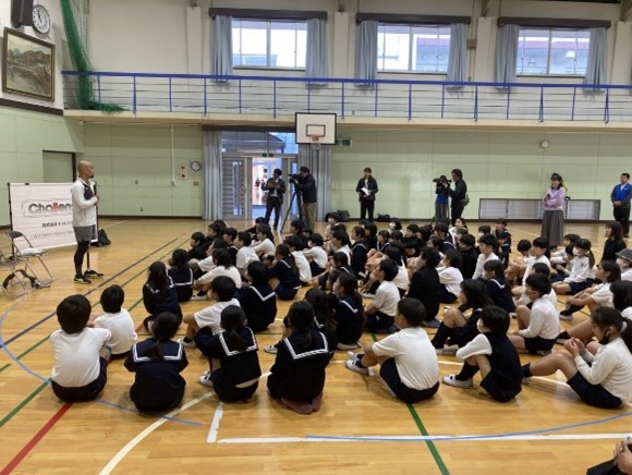 6年生65名が参加しました。初めての義足に最初は戸惑っていた皆さんでしたが、山本選手から義足の使い方や歩き方を直接指導してもらうことで、2,3巡目になるころには、すっかりうまくなっていました。山本選手が世界中の選手と話すため英語の勉強をしたり、新たに競技ゴルフにも取り組んでいることを聞き、失敗を恐れずチャレンジを続けて自分を高めていくことの大切さを学ぶことができました。この日、同じ大竹市内にある三菱ケミカル広島事業所では、従業員向けに山本選手の講演会も行いました。