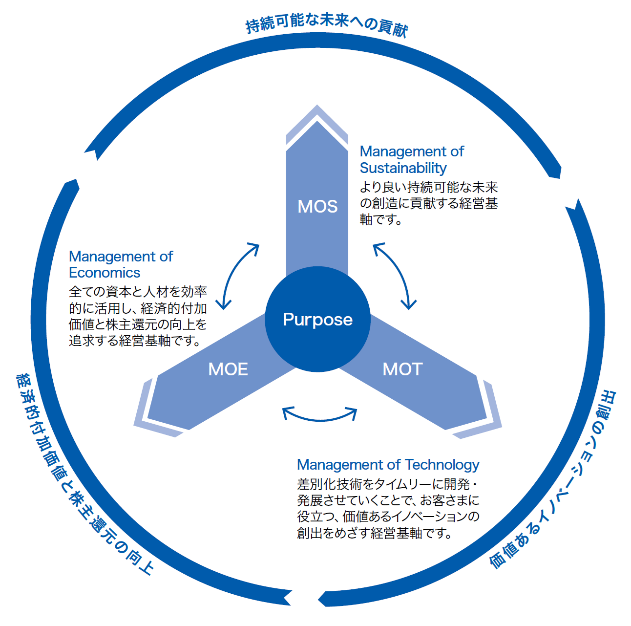 2011年から当社グループを導く「北極星」として掲げ続けてきたKAITEKIの実現をめざし、新しく定義したグループ理念のもと、MOT・MOE・MOSの3軸による経営を加速していきます。