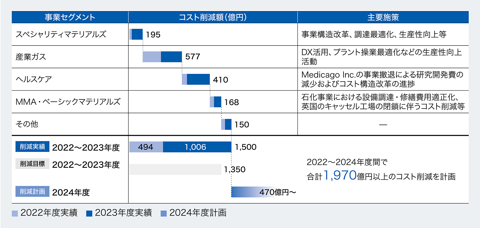 第1四半期終了時点で、ディスプレイ関連製品や生成AI向けの半導体関連製品が好調で、MMAモノマー市況の上昇による増益効果もあり、2024年度上期のコア営業利益予想1,100億円に対し、826億円を計上しています。期初の想定を上回る進捗ですが、依然として需要動向に不透明さが残っていることに加え、複数の事業構造改革案件にさらなる精査が必要であり、現時点で業績への影響を取り込むことは困難であることから、予想値は据え置いています。期初予想は、必達の目標として全社一丸で臨んでいます。