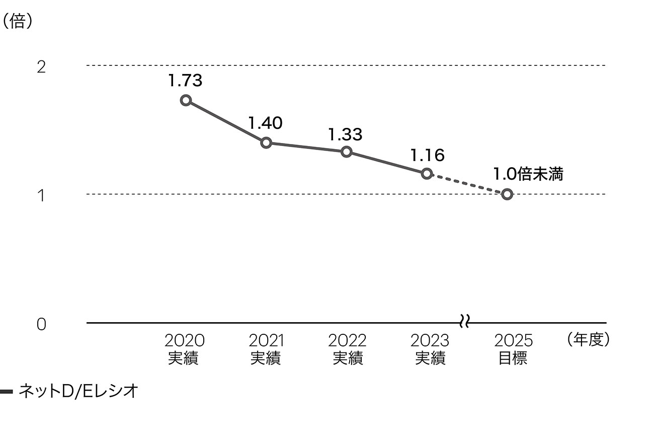 ネットD/Eレシオの改善による財務体質の健全化に努めています。2023年度末時点のネットD/Eレシオは1.16倍でしたが、2025年度には1.0倍未満をめざしています。有事の際の資金調達を見据えて格付けには留意しており、2024年11月に発表予定の次期中期経営計画では5年先の目標としてより低い数値を掲げる予定です。また、銀行借入以外にもコマーシャル・ペーパーや社債の発行、業態の異なる複数のグループ会社間でのグループファイナンスなど、資金調達手段の多様化も進めています。なお当社グループは事業展開する国や地域の通貨は原則として現地で調達しているため、国内金利の上昇による影響は限定的となる見込みです。