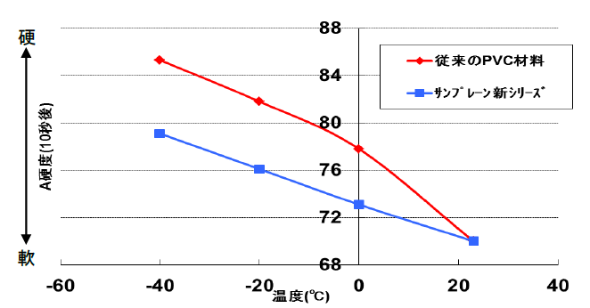 一般的にPVCは、機械特性の温度依存が高く、使用環境による影響が受けやすい素材と言われており、低温環境下ではPVCが硬くなることでゴム弾性が低下してしまいます。