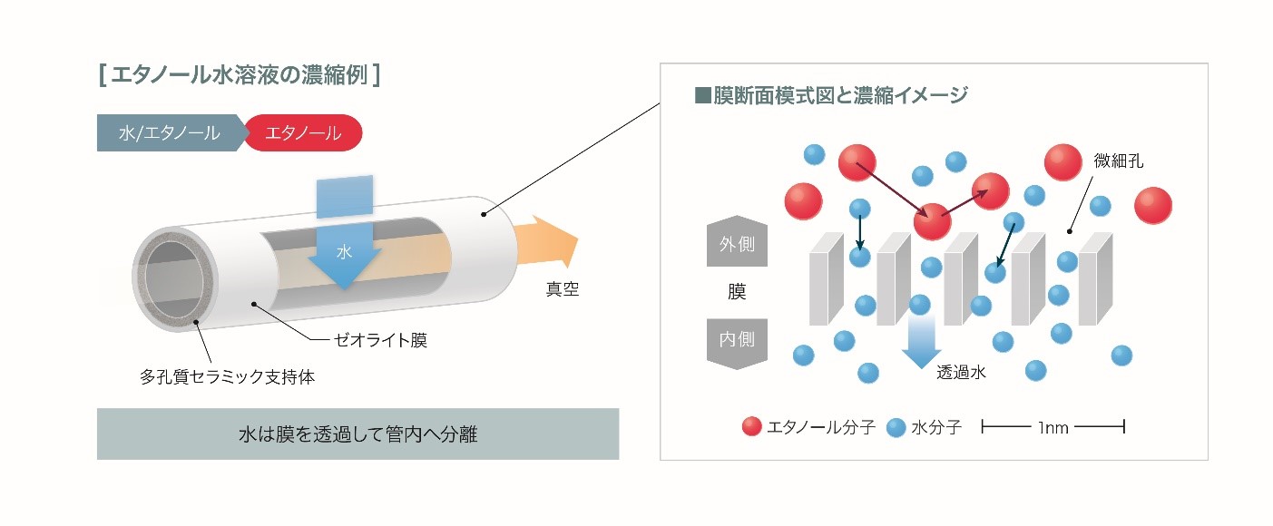 バイオエタノールを燃料として用いるためには、脱水して99%以上の濃度にする必要があり、脱水工程におけるエネルギー消費の削減が強く求められています。「ZEBREX™」は、ゼオライト膜が持つ均質な細孔により、水分子を選択的に分離して取り除くことができるうえに、従来のPSA(Pressure Swing Adsorption = 圧力変動吸着)法によるバッチ式の脱水システムとは異なり、連続運転が可能です。