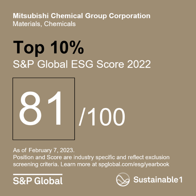 三菱ケミカルグループ株式会社(本社:東京都千代田区、社長:ジョンマーク・ギルソン、以下「当社」)は、米国S&P Global社によるサステナビリティ格付である「The Sustainability Yearbook 2023」において、「上位10%(Top 10% S&P Global ESG Score 2022)」に選定されました。