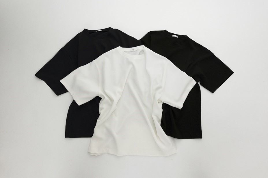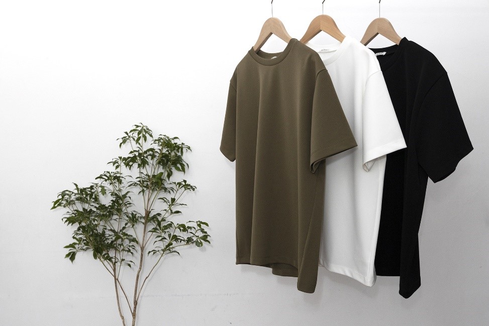 生地は肉厚のニット生地を採用し、しっかりとした厚さのため1枚でも存在感と清潔感のある着心地を実現しました。表面にシャドーツイル模様を施すことでこだわりを感じさせるアイテムです。