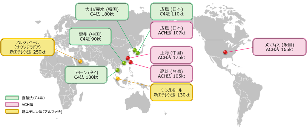 なお、広島事業所で生産しているC4法MMAモノマー、岡山事業所(岡山県倉敷市)で生産しているアクリロニトリルおよびグリシン酸ソーダ、関東事業所・鶴見地区(神奈川県横浜市)で生産しているアクリルアマイドについては今後も生産を継続します。