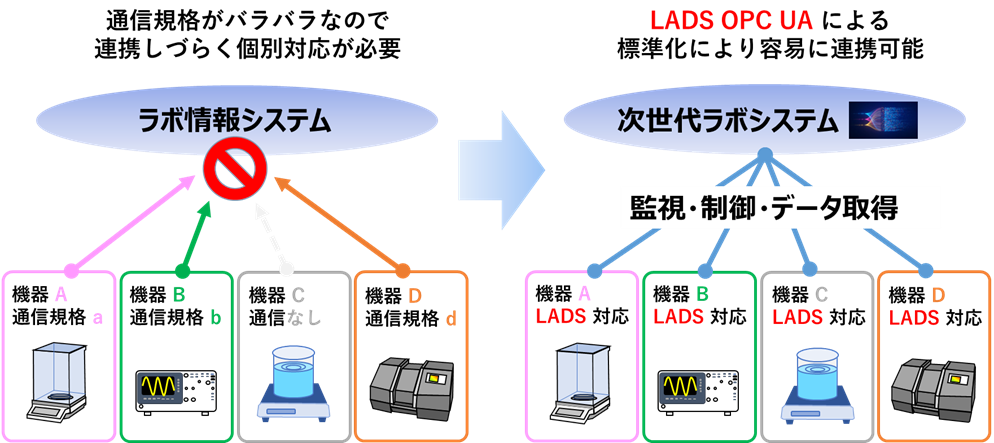 両者は、これらのボトルネックを取り除き、ラボのDXをより推進するため、国内初となるラボ用機器の通信および相互運用規格の適用に向けた取り組みを行い、LADS OPC UAの早期普及を目指します。LADS OPC UAを導入し、多くの実験機器をプラグ&プレイ※2でつなぐことで、容易かつセキュアに実験機器の遠隔監視・制御やデータの取得蓄積が可能になります。さらに、複数の実験機器や研究者間の効率的な連携も可能となるため、自動化にかかる時間やコスト、技術的な制約を減らせます。